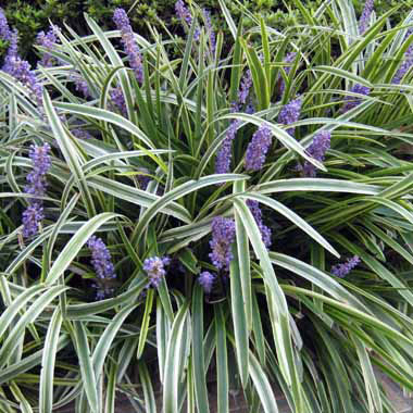 花期は夏から秋にかけてですが、細長い葉にも鑑賞価値があり、特に斑入りの品種は明るい雰囲気を作るので人気があります。総状に紫色の花が咲いた後には、黒い光沢のある 5〜6 mm ほどの実が結実します。